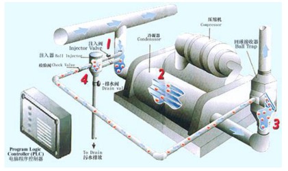 1、电脑程序控制器启动清洗循环,将注射阀门打开,控制特殊球进入冷凝器循环系统;