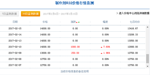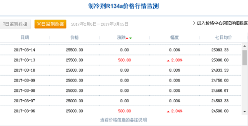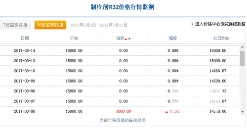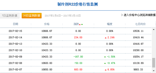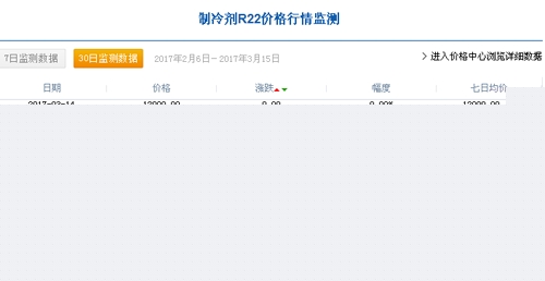 2017年制冷剂价格全线上调,据有关数据监测显示,3月14日,中国R22制冷剂厂家出厂价格集中在12000元/吨,2月7日在9883元/吨,同比上涨21.4%;