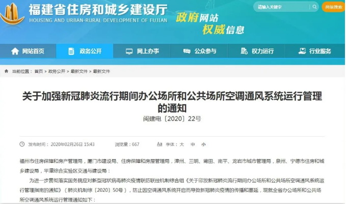 为进一步贯彻落实国务院应对新型冠状病毒肺炎疫情联防联控机制综合组《关于印发新冠肺炎流行期间办公场所和公共场所空调通风系统运行管理指南的通知》,防止因空调通风系统开启而导致新冠肺炎疫情的传播和蔓延,日前,省住建厅印发《关于加强新冠肺炎流行期间办公场所和公共场所空调通风系统运行管理的通知》。
